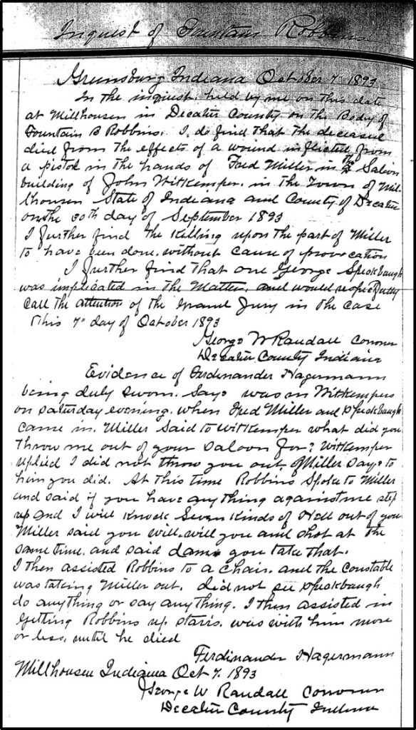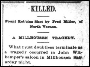 As the Saturday Review of Greensburg, Indiana, headlined on October 7, 1893, there was “Serious Trouble at Millhousen Saturday Afternoon: Fount Robbins Shot by Ferdinand Miller and Can Not Recover, the Doctors Say.” Other local newspapers had similar headlines.