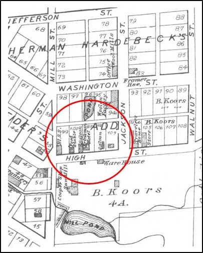 Ferdinand Miller, formerly of Millhousen, now of North Vernon just to the south in Jennings county, and George Speckbaugh (variously spelled) had been visiting in Millhousen, and by one report “drinking during the day and by evening had become pretty well loaded with bad liquor.” There were a couple of saloons in Millhousen at the time, and they decided to go visit John Witkemper’s drinking establishment. (The location of saloons are indicated on the map – probably on the same block as today’s Stones Family Restaurant.)