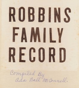 By the late 70s I had received what was basically a typed copy of the family record, though I didn’t recognize it at such.  That information was the foundation on which all of my family research was based.  Years later, one of Ada’s grandnieces passed along Ada’s “Robbins Family Record” to me to be its current caretaker.  There was very little new information in the book for me, but I was pleased to see all the inserted clippings of