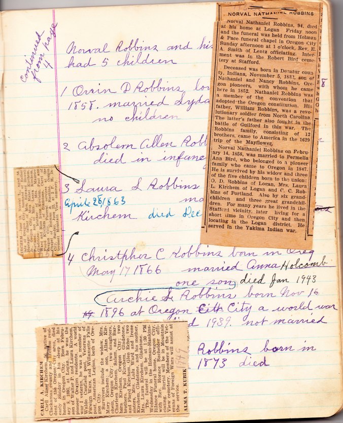 One of the early family historians in Oregon branch of the Robbins family, was Ada Ball McConnell.  Ada kept a small notebook where she recorded family data, from the earliest information she knew about the family up births and deaths in the late 1950s.  I am currently the custodian of this family treasure.