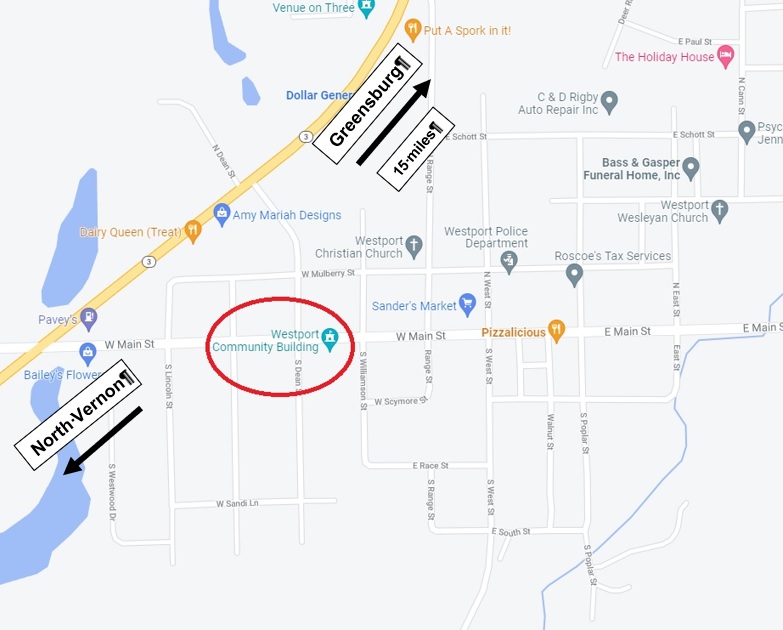 Location: Westport Community Building, Westport, Indiana (see directions below)