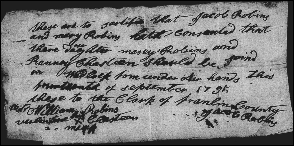 Jacob and Mary Robbins gave permission for their daughter Mary Robbins to marry Valentine Chastain; witnessed by William and Absalom Robbins. While not stated in the marriage bond, witnesses William and Absalom Robbins, both over the age of 21, are brothers of Mary.