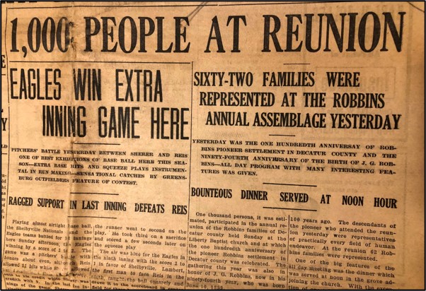 One thousand persons, it was estimated, participated in the annual reunion of the Robbins families of Decatur county held Sunday at the Liberty Baptist church and at which the one hundredth anniversary of the pioneer Robbins settlement in Decatur county was celebrated………the descendants of the pioneers who attended the reunion yesterday were representatives of practically every field of human endeavor. At the reunion 62 Robbins families were represented.