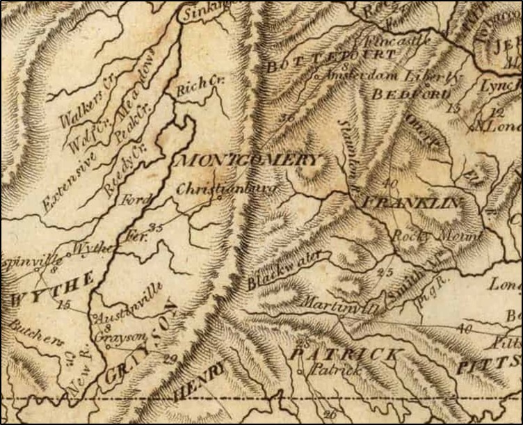 1804 Virginia map showing location of Botetourt, Franklin, and Montgomery counties