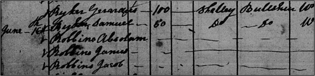 Example of tax list entry: 1800 Shelby County, Kentucky, listing Absalom, James, and Jacob Robbins