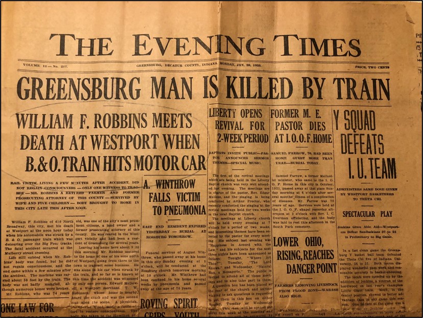 Not only was the news slow to reach his wife, but due to the fact there were multiple William Robbins’ in Decatur County there was confusion about who exactly had been in an accident. The newspaper reported: “When the news first reached Greensburg it was reported it was William H. Robbins of southeast of Greensburg. Later it was reported that it was Will S. Robbins of Horace.”
