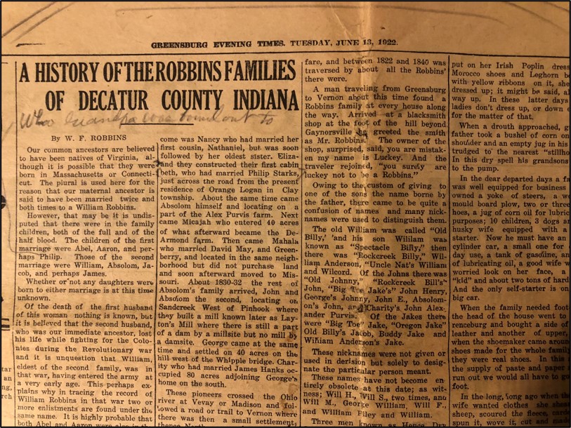 At the 1922 Robbins reunion, celebrating 100 years of the Robbins family being in Decatur County, Indiana, a man named William Franklin (W. F.) Robbins read a history he wrote about the family. This history was also published in the newspaper along with the story about the reunion.