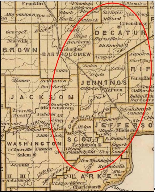 Some of these families first settled in Jennings and Scott counties, Indiana, located to the south of Decatur. Keep in mind distances here are fairly small so even if someone lived in another county, they could actually be just down the road. Here is a map, just for comparison, of the geographical closeness of these areas.