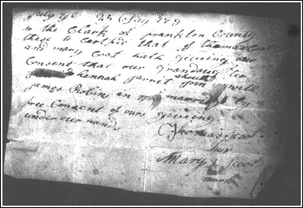 James married Hannah Jarrett on 3 August 1790 in Franklin county, Virginia. Hannah’s grandparents provided consent.