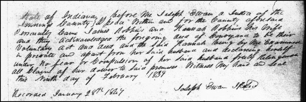 In looking at land records in Jennings county, I was excited to find one recorded in 1847 where James and Hannah Robbins sold land to Jacob Robbins. That would have advanced their lifetime a bit in the records. Unfortunately, the land transfer actually took place in 1839 but wasn’t recorded until 1847. Jacob probably had a reason to demonstrate legal ownership at that point and took the deed to the courthouse for recording, still leaving us with the 1840 census as the last appearance of James in the records.
