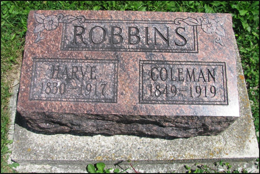Coleman Robbins, the only known child of Harvey and his first wife, is also buried here. He was struck by a train in 1919, had never married, and has no descendants. Some years ago I came across the coroner’s report for Coleman. Among the information on that report was the following statement: “I was called to Westport Ind. on the above date because of the death of Coleman Robbins who was accidentally killed by a Big Four S. Bound train….Mr. Robbins was crossing the RR with a wheel-barrow load of kindling and being deaf never heard the train whistle….”