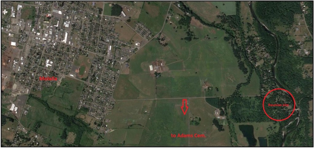 Molalla is also the site of the Adams Cemetery, where Jacob and Sarah, many of their children, and other relatives are buried. Located between Molalla and Feyrer Park it will make an easy side trip. From S. Feyrer Park Road, almost halfway between Molalla and the park, turn right, south, on S. Adams Cemetery Road and follow that road south to the cemetery. I’ll have a post about Adams Cemetery and some of the prominent family burials there in the future.