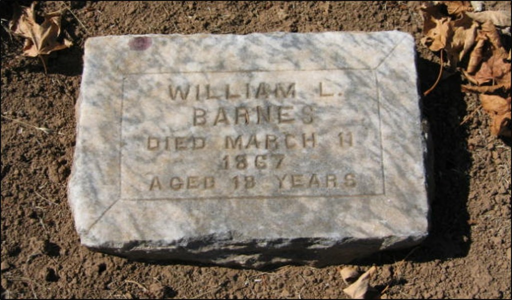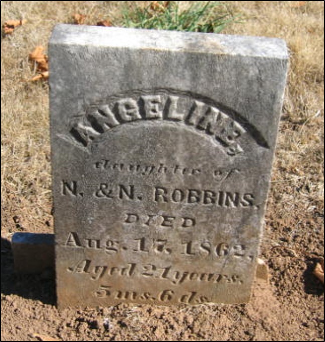 The next earliest burial is that of William’s youngest sister Angeline Robbins, who died in 1862 at twenty-one; then came a young son of Nathaniel Norval Robbins, Absalom Allen Robbins, in 1863. The patriarch himself, Nathaniel Robbins, drowned in December of 1863, and his grave is marked with a large gravestone. His daughter Nancy (Robbins) Barstow followed in 1872 as did bachelor son John Dow Robbins in 1873. A young son of Nathaniel Norval Robbins, Absaloma Allen Robbins, died and is buried there in 1863.