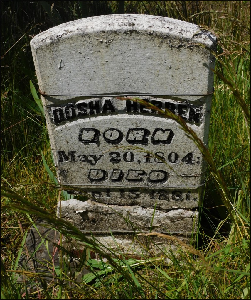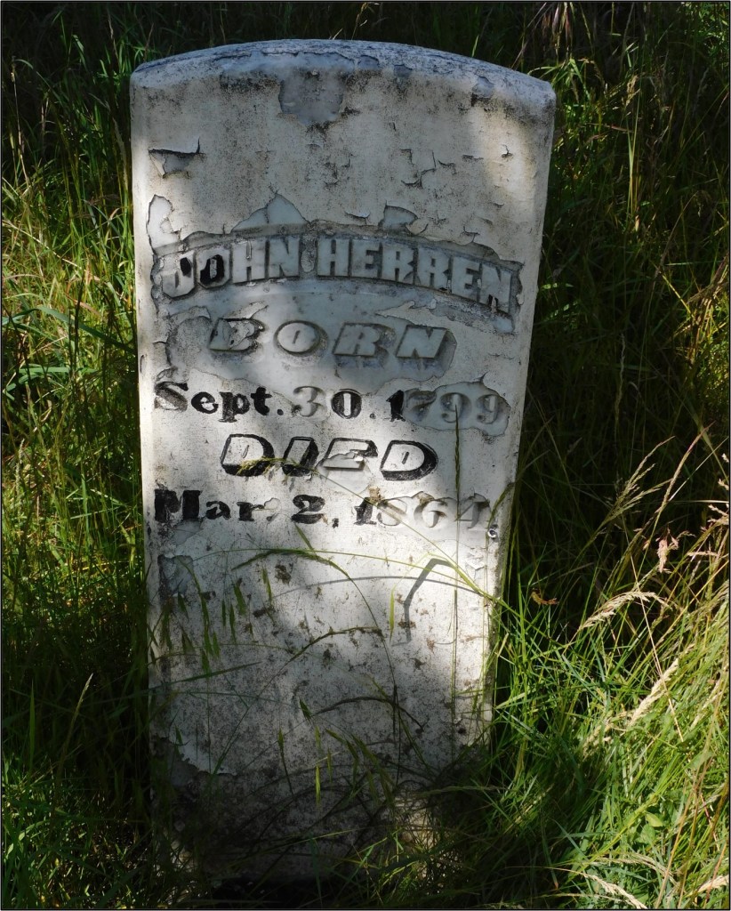 On the ridge above their house was the Herren cemetery. The earliest burial seems to be that of John Herren himself, who died in March of 1864. Several grandchildren, Charles C. Herren in 1868, Olevia Herren in 1874, and Nannie Welch in 1872 were also buried there. Dosha (Robbins) Herren died in 1881 and was buried beside her husband John.