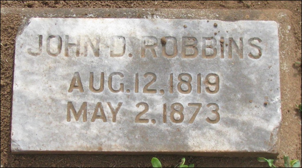 The burial of a Robbins in the cemetery that can be confirmed is that of William Franklin Robbins who died in May of 1856 after a hunting accident. I’ve quoted this reminiscence from his daughter Melissa before but it’s worth sharing again: