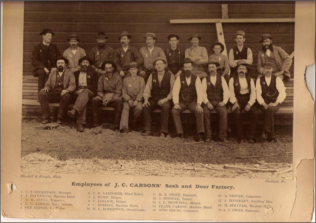 An undated photograph of the employees of the J. C. Carsons’ Sash and Door Factory in Portland shows C. C. Robbins in the top row, second from the right, and listed as a “machine hand” which is also the occupation he is listed as in the 1900 census. Perhaps the photo was taken around the same time.