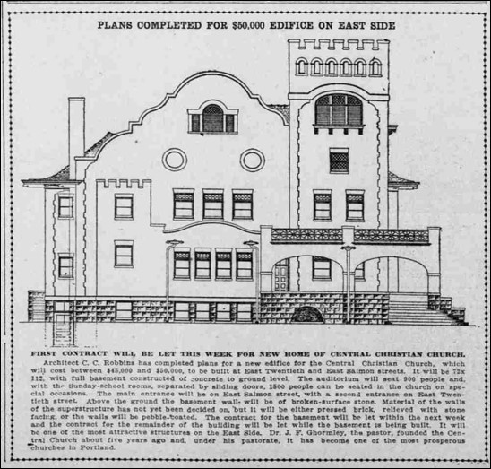 More information comes from numerous newspaper articles such as: “Architect C. C. Robbins has completed plans for a new edifice for the Central Christian Church, which will cost between $45,000 and $50,000, to be built at East Twentieth and East Salmon Streets.” (see drawing below) (Sunday Oregonian, 12 July 1908, sec. 3, p. 4, col. 3-6)