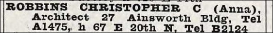 Later in 1916 Chris has added more to his resume: “C. C. Robbins, architect, has joined J. H. Hill and is engaged in the manufacture of billiard, pool and bowling alley supplies and ivory, fiber and wood novelties at 302 Pine Street.” (Oregon Daily Journal, 21 Oct. 1916, p. 9, col. 4-5).