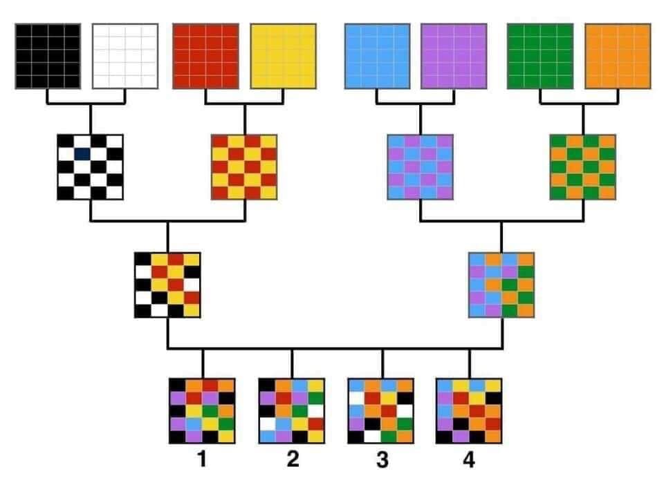 This chart shows four siblings with colored squares representing the DNA they have received from the parents, grandparents, and great-grandparents. Each sibling is slightly different so testing each sibling is very useful for genealogy.