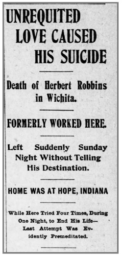 On Monday, August 5th, 1901, Herbert Robbins, checked into the Hamilton Hotel in Wichita, Kansas, under an assumed name. Sometime around midnight, the porter heard a noise coming from Robbins room, and entered the room through the transom. He found Robbins groaning in his bed after apparently ingesting laudanum or carbolic acid (reports varied). A local physician was called and began to treat Robbins, but he died at about 1:30 am. The local newspaper, the Wichita Daily Eagle, as well as other newspapers in Kansas and Indiana, reported the suicide of this young man, with the full story slow in coming.