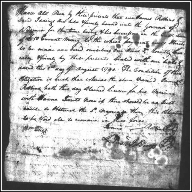 James married Hannah Jarrett on 3 August 1790 in Franklin county, Virginia. Hannah’s grandparents provided consent.