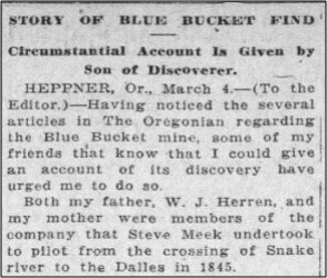 Having noticed the several articles in The Oregonian regarding the Blue Bucket mine, some of my friends that know that I could give an account of its discovery have urged me to do so.  Both my father, W. J. Herren, and my mother were members of the company that Steve Meek undertook to pilot from the crossing of Snake river to the Dalles in 1845.