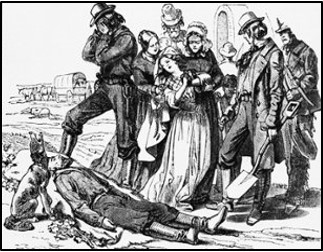 The previous night the California party enticed a number of Shoshone squaws into their camp and after they had imbibed a large amount of fire water, Dixie Johnson engaged in a quarrel with another member of the party, claiming that he was attempting to steal Johnson’s squaw.  As a result of the argument, Johnson stabbed and killed the other member of the party.  A jury was impaneled and Johnson was tried and found guilty of murder.  The volunteer judge sentenced Johnson to be shot by one member of the jury.  Each of the six jurors was given a rifle, only one of which was loaded, the five other guns containing blanks.  The murderer was then taken over a hill beyond the camp, stood up against a tree, and the six men pointed their guns at his heart and fired.  Johnson refused to be blindfolded or tied and smiled at his executioners and gave the order to fire.  He was buried under the tree with a headboard stating ‘Here lies Dixie Johnson, murderer, who died July 15, 1862.